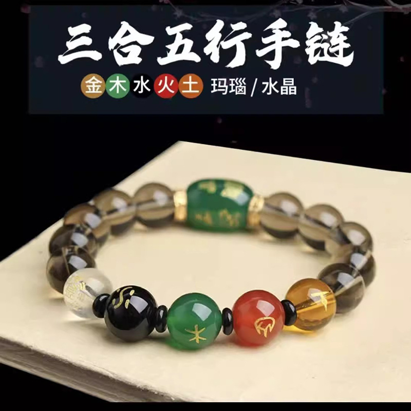 天然氷種黒曜石緑瑪瑙三合生肖ブレスレット茶水晶金木水火土五行10-12mm
