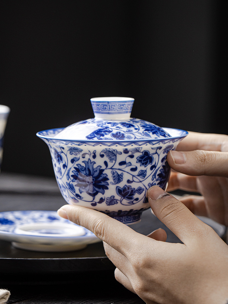 レトロな蓮の花のカバー付きボウル、ホバリングティーカップ、羊脂翡翠白磁、シングル青と白の熱くないセラミックティーセット