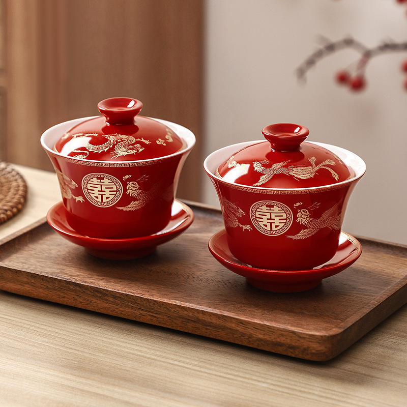 敬茶カップ、結婚式の食器セット、結婚式のボウル、乾杯、ティーセット、ボウルペア、赤い結婚式の贈り物用品