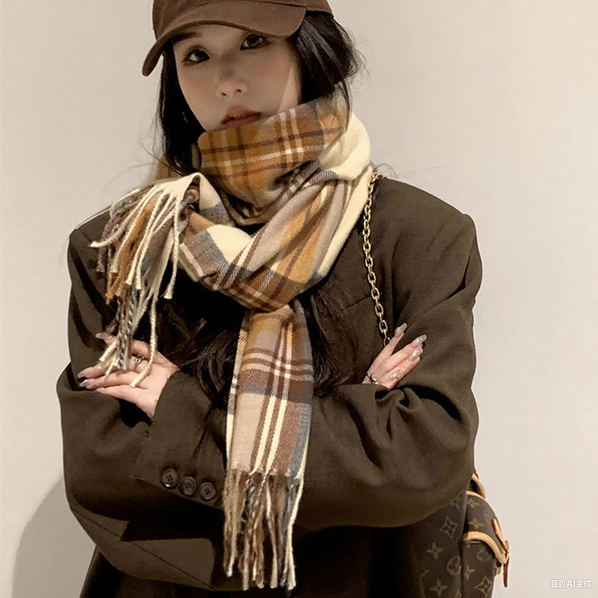 韓国風チェック柄スカーフ、雰囲気のある女性用秋冬暖かい万能スカーフ、イミテーションカシミヤ高級感ショール、ネックウォーマー、卸売、防寒