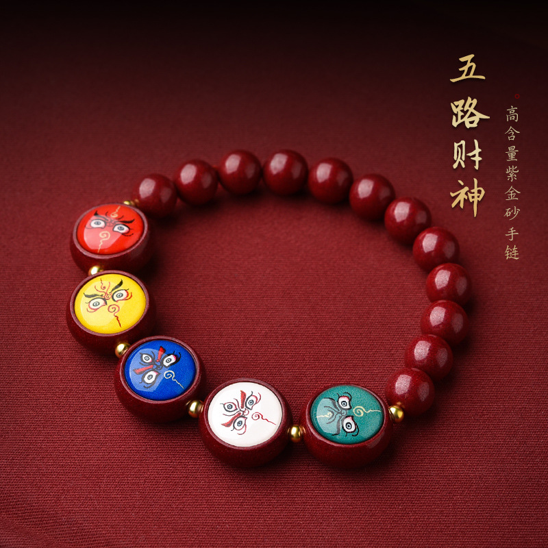 朱砂五路財神ブレスレットは赤黄白黒緑五色財神を結って金木水火土の女性のネックレスの玉を補います。