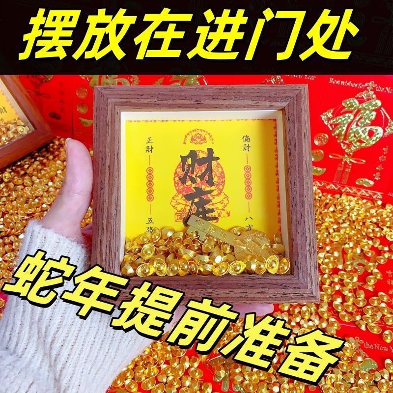 富の神が富を引き寄せるフォトフレームの装飾品、小さなインゴット、宝の器、お金が家に届く、金の鍵、富のテーブル