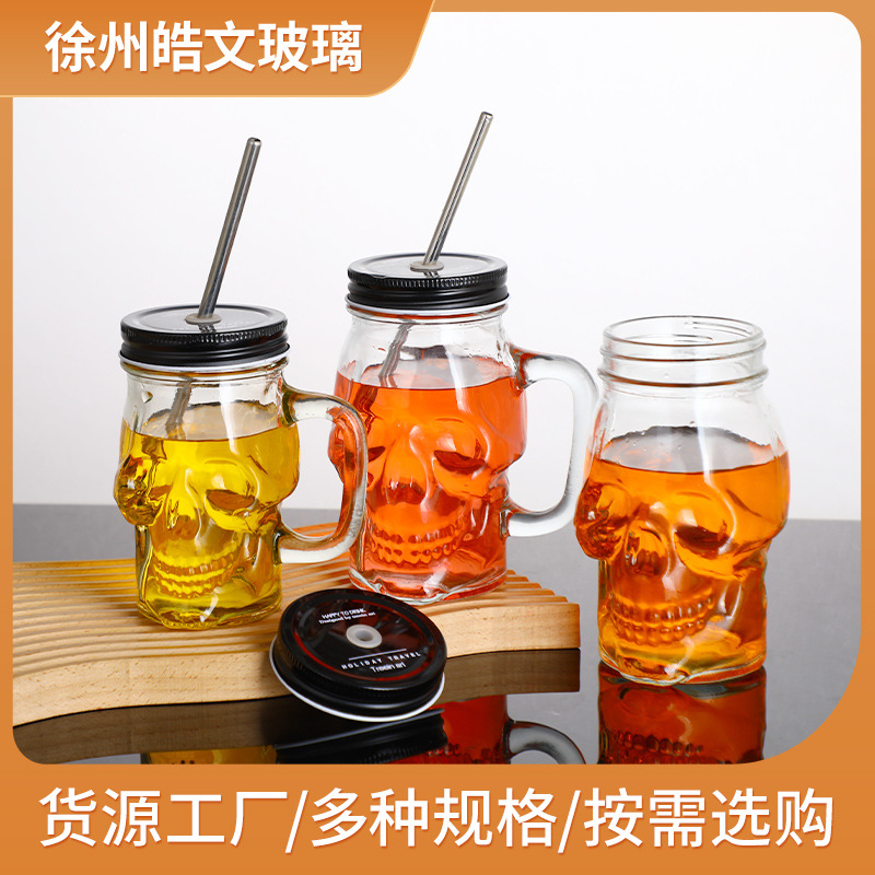 蓋付きスカルカップ メイソンジャー 透明コック型コールドドリンクカップ MASONガラス水 ハロウィンミルクティーカップ