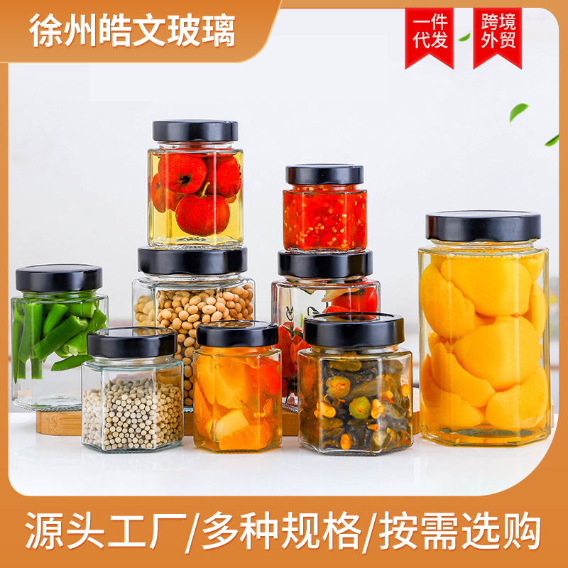 ガラス六角形ハニーポット 透明ガラス瓶 380ml ハチミツ・ジャム瓶 漬物瓶 チリソース瓶 蓋付き