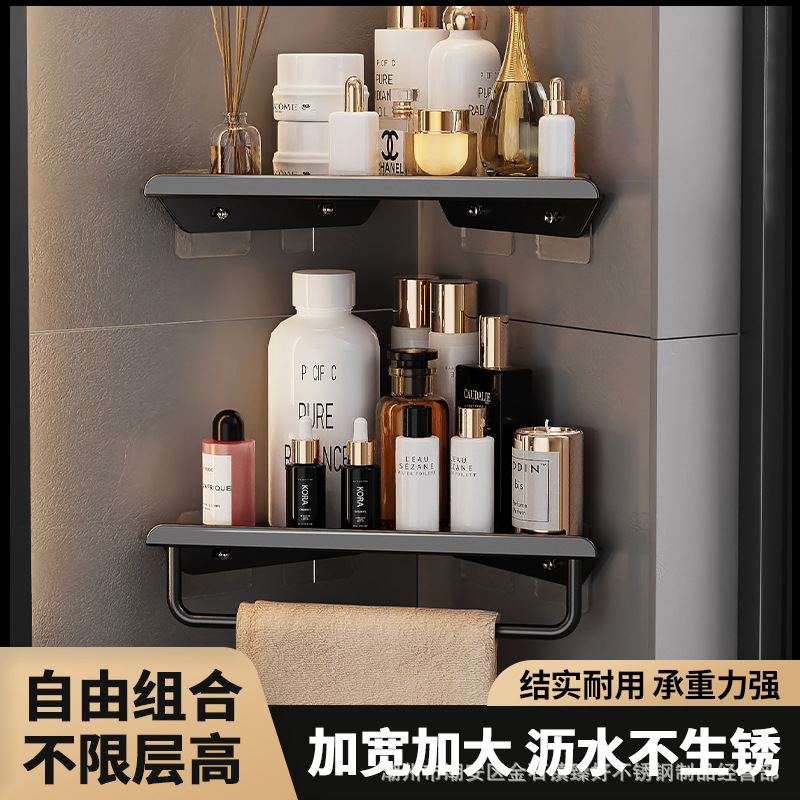 軽くて豪華な風の浴室の物置棚のステンレスの浴室の角棚の台所のトイレの角の収納棚は穴を開けないでください。