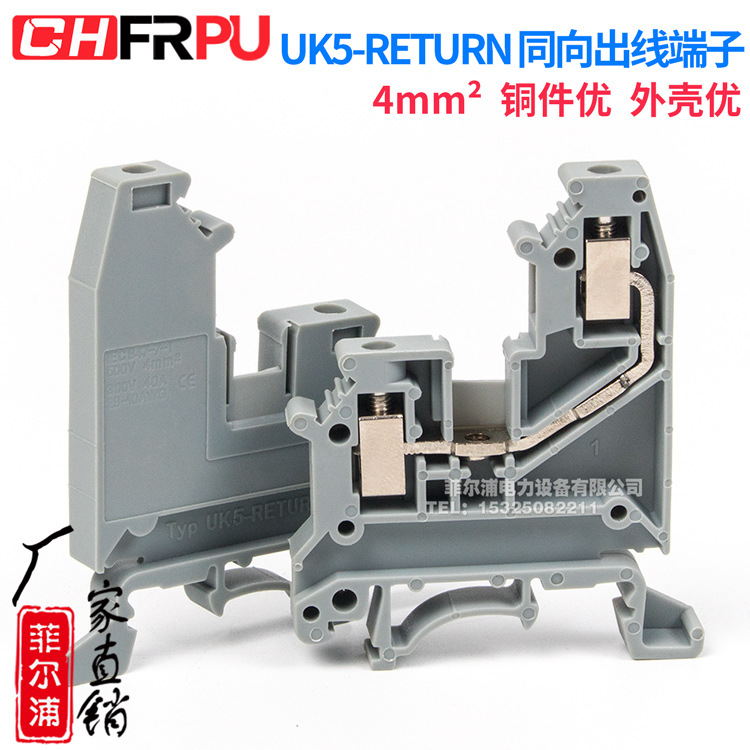 ガイドレール式組み合わせ配線端子UK5-RETURNの一方の出入り端子列に銅部品を厚くして滑りません。