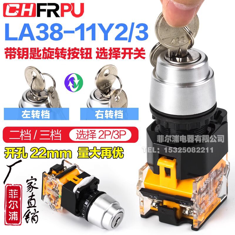 電源ノブスイッチ キー付き セルフロック 2速 3速 LA38-11/Y2 20Y3 ロータリースイッチ 22mm