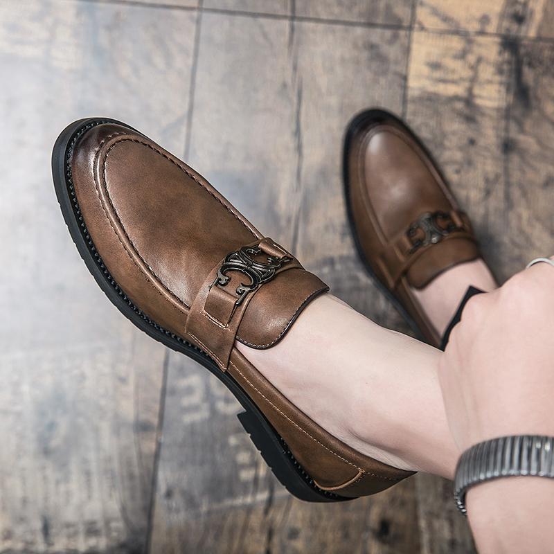 革靴メンズ 2025 春と秋の新スタイルレトロ英国スリッポンラウンドトゥローファーレイジーカジュアルメンズシューズ