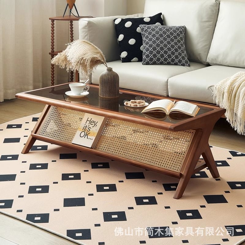 フレンチレトロコーヒーテーブル無垢材籐リビングルームホームダイニングテーブルシンプルモダン小型アパート兼用ガラス長方形