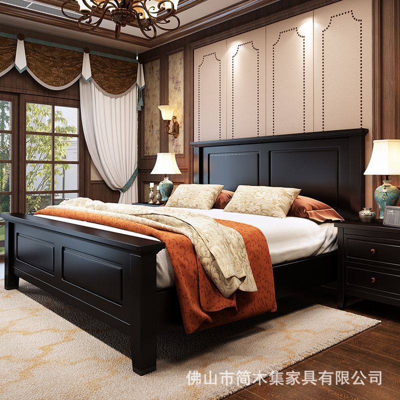 アメリカンレトロラバーウッド無垢材ベッドマスターベッドルームモダンシンプルダブルベッドブラックフルベッド収納ベッド