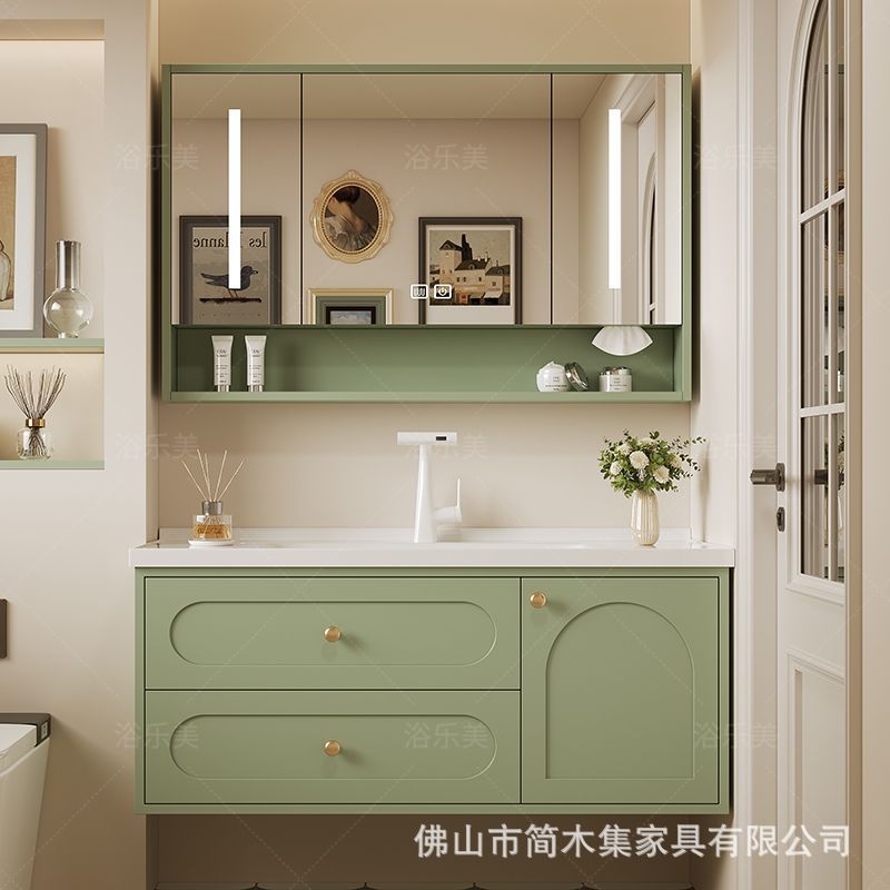 【繊細な肌触り】オーク材バスルームキャビネット セラミック一体型洗面台 クリーム系バスルーム洗面台キャビネット組み合わせ