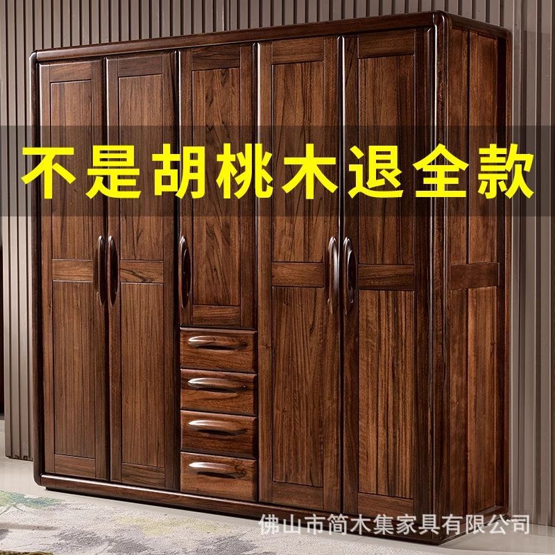 全無垢材大型ワードローブブラックウォールナット中国風3、4、5ドア家庭用収納キャビネット両開きドアログ寝室ワードローブ
