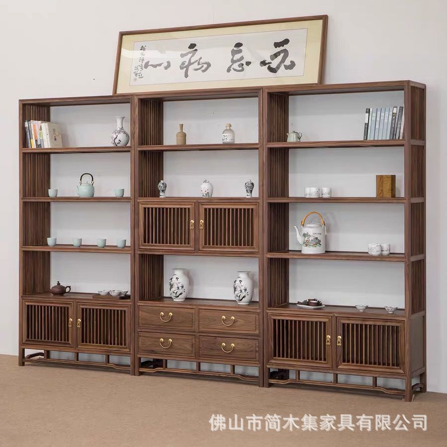 新しい中国風の無垢材の本棚組み合わせブラックウォールナットティールームボーグラックディスプレイキャビネット収納ラック古いニレ禅本棚