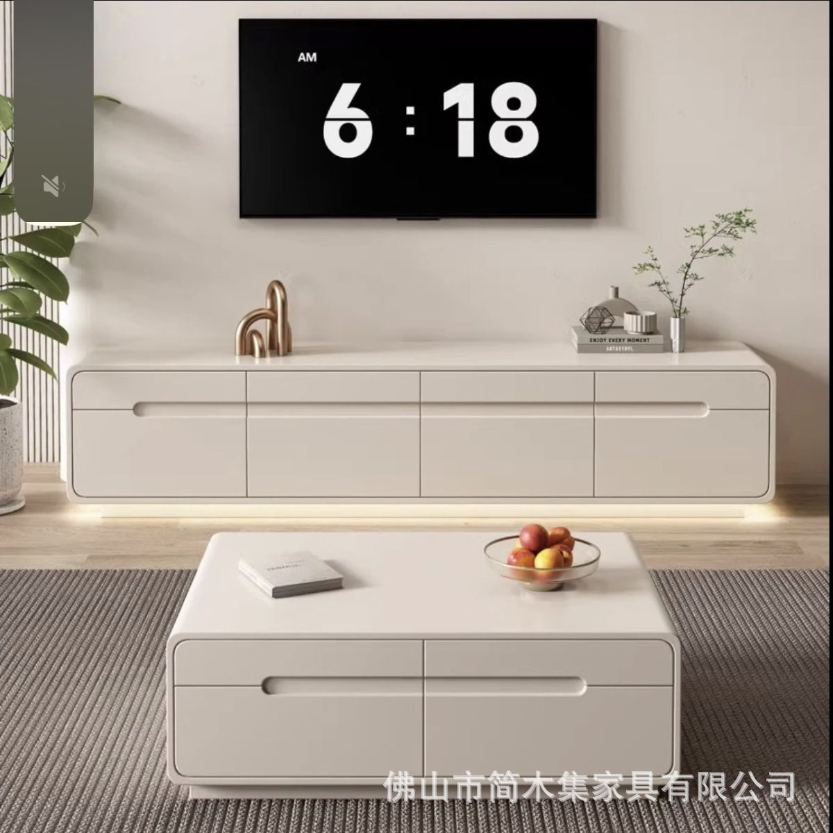 二層無垢材テレビキャビネットとコーヒーテーブルの組み合わせ床置きリビングルームホワイトライト高級ホーム北欧ミニマリストな雰囲気