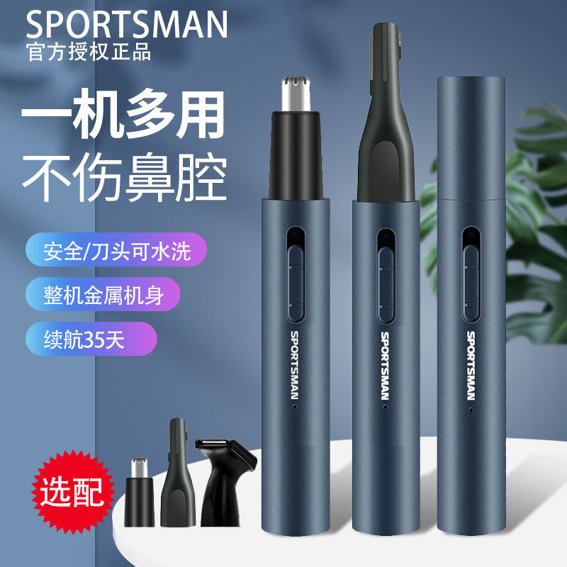 充電タイプの電気鼻毛修理器の男性は鼻毛を剃ります。はさみは鼻孔を剃ります。