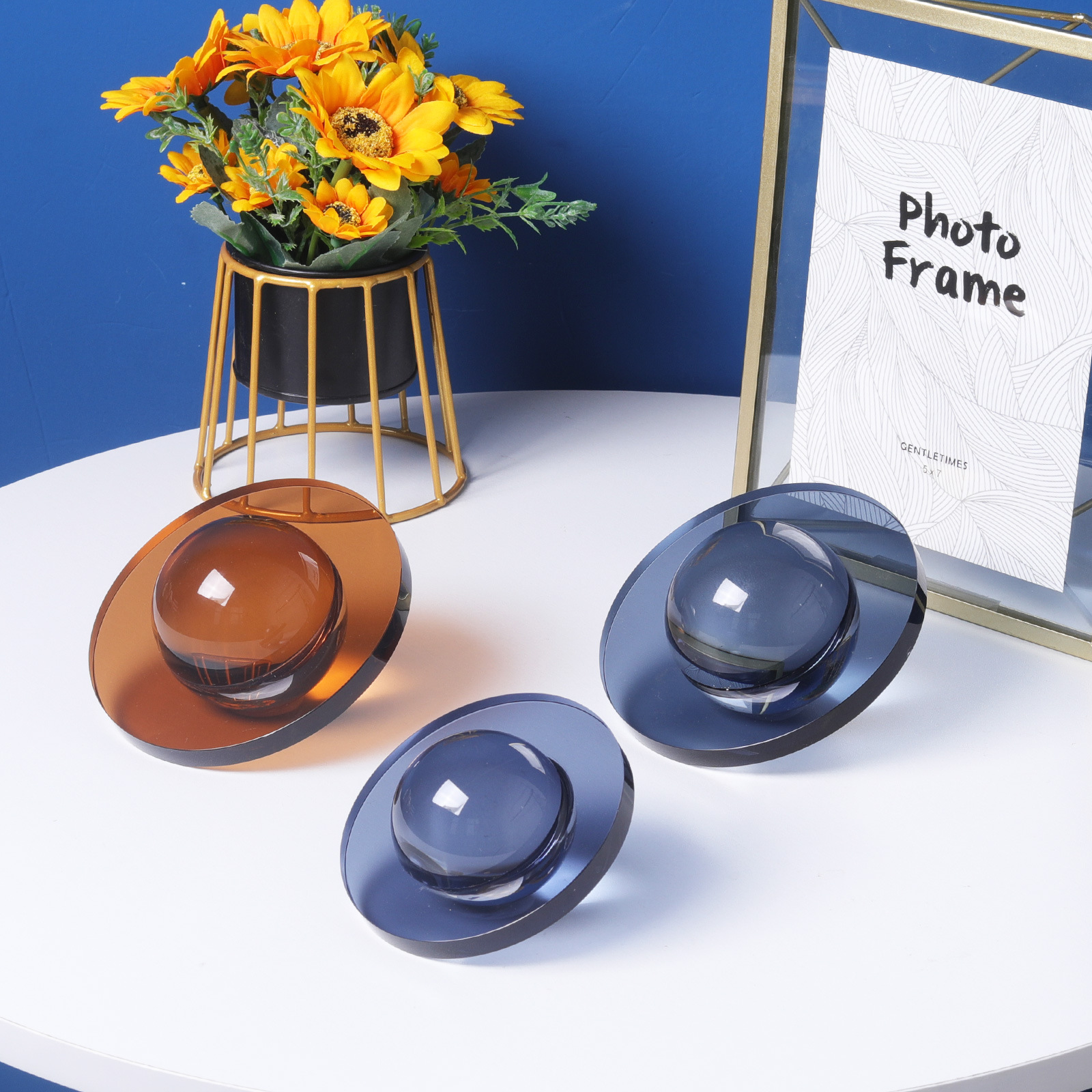 北欧のシンプルなスタイルの茶色の銀色の煙と灰色の水晶のボールの置物の家庭の柔らかい星のボールの水晶の空飛ぶ円盤
