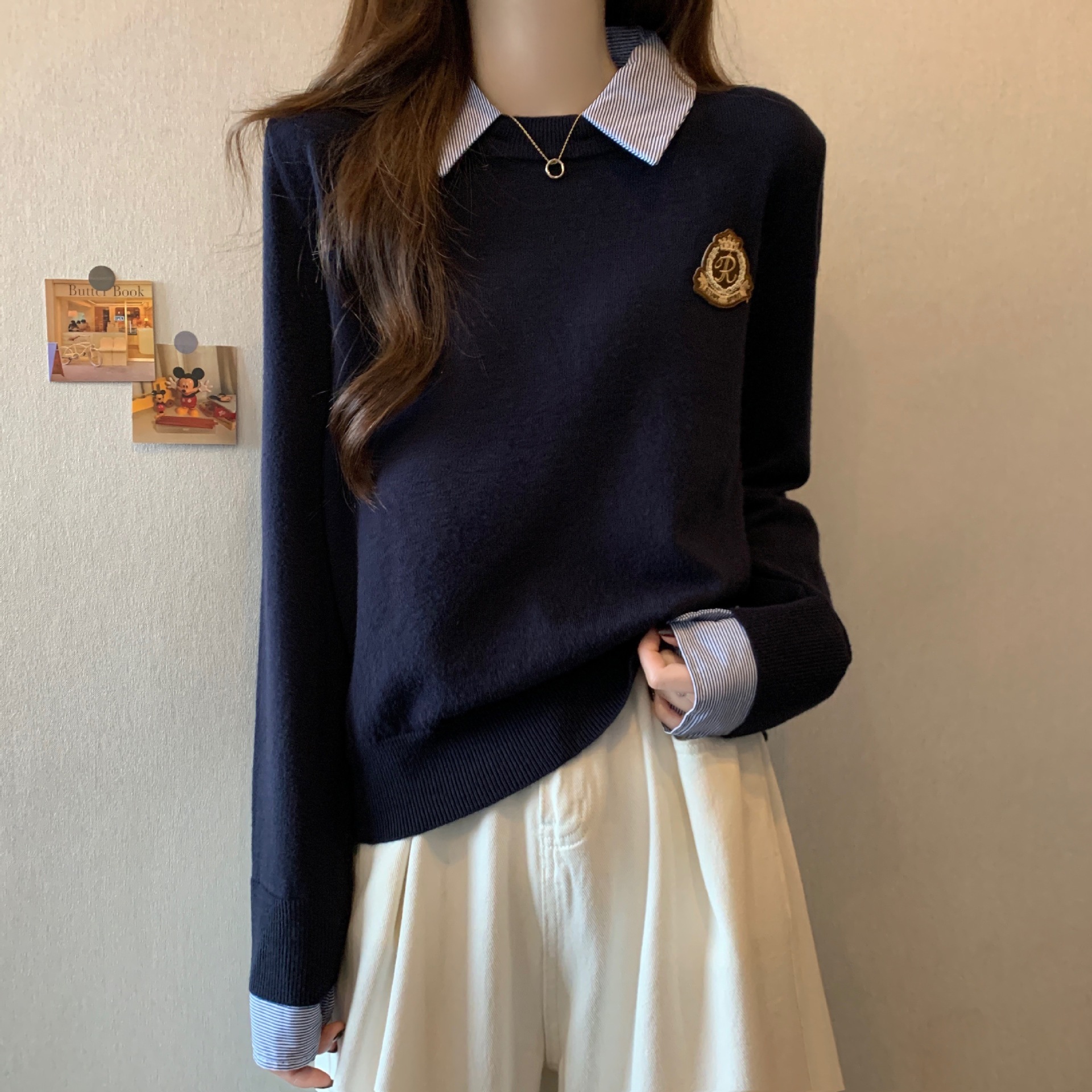 学院風は偽の2つのニットの女性の秋冬の2024の新型のゆったりしている短い長袖のセーターのカーディガンの上着をつなぎ合わせます。