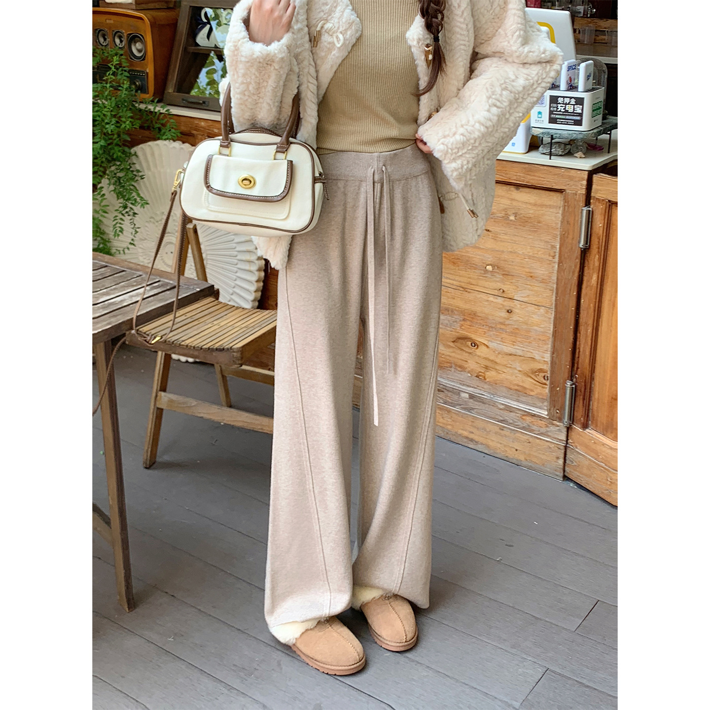 米の白い広腿のズボンの女性の春秋の2024の新型の高い腰はやせていてゆったりしています。