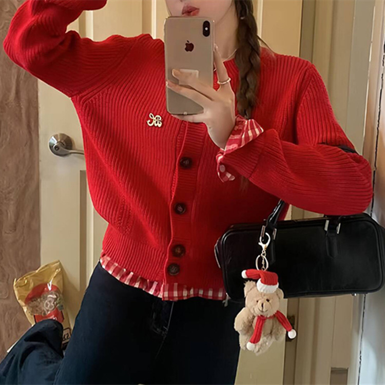 韓国系の偽の赤い格子のニットの小さいカーディガンの女性の秋冬のデザイン感はセーターのコートの短い上着をつなぎ合わせます。
