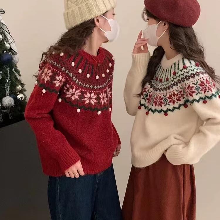 レトロなジャカード新年クリスマスの赤いフェア島のセーターの女性の頭はゆったりしています。