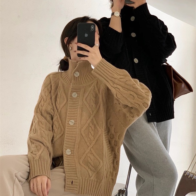 新しい秋冬のセーターの女性のコートのカーディガンは麻の花を厚くして怠惰な風の復古の韓国版のゆったりしている高襟のニットの冬です。