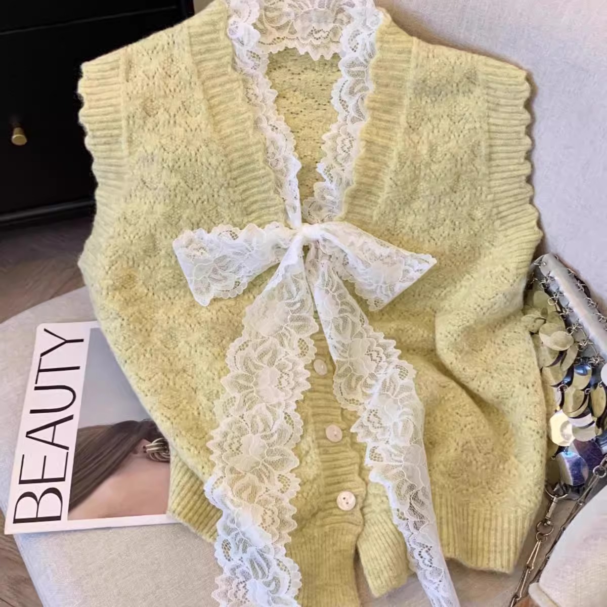 小香風レース蝶結びニットベストレディース2025秋冬重ね着高級感ベストノースリーブvネックトップス