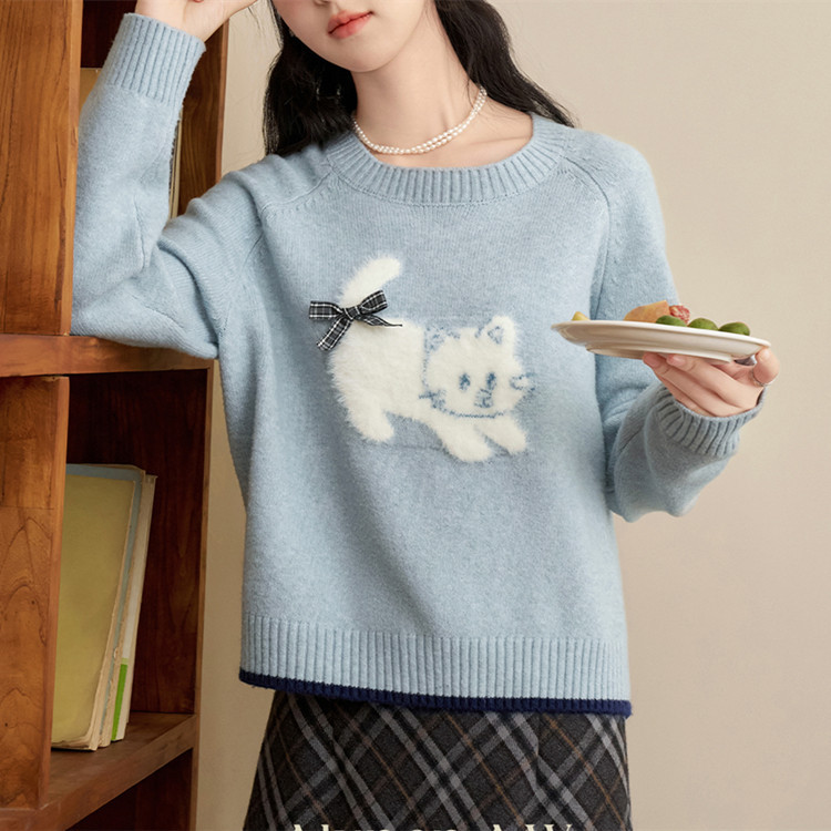 青い丸首のセーターの女性の春と秋の2024の新型のデザイン感のゆったりした立体の蝶結びのプルオーバーのニットの上着
