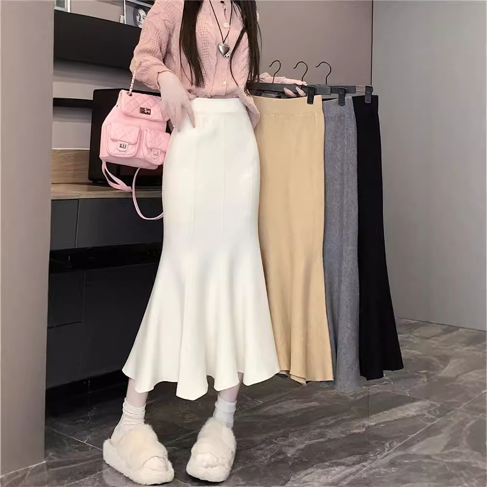 大きいサイズの純色の修身のニットのスカートの女性の秋の2024の新型の魚の尾のスカートは少し太っています。