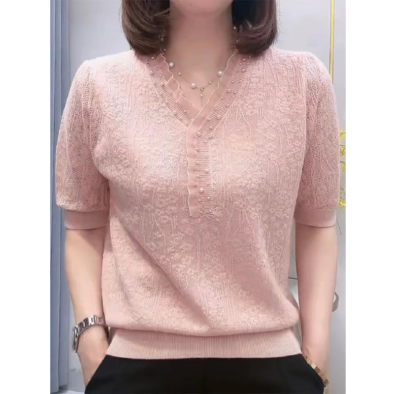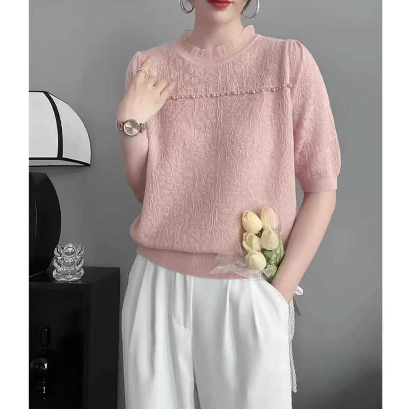 レースの透かし彫りの半袖の底のシャツの女性の2025新型の秋冬のデザイン感の洋風のトップビーズのニットのニットの中で底を打ちます。