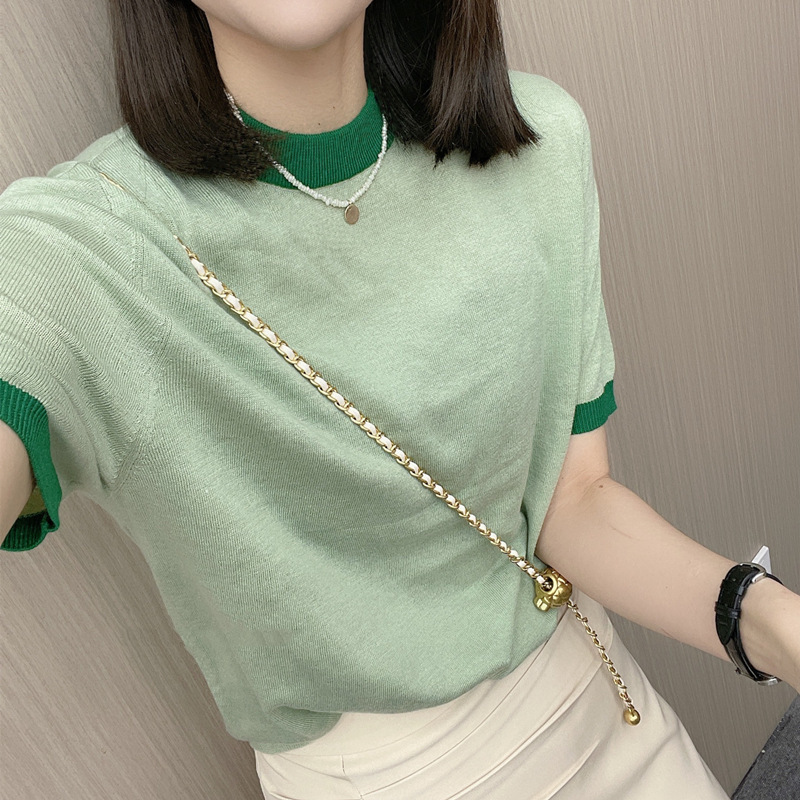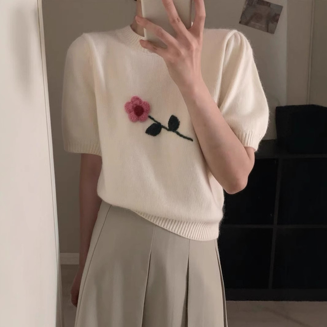 色の丸首の半袖のニットの女性の夏のファッションの甘い減齢の刺繍の氷の糸の上着はゆったりしていてやせているtシャツを現します。
