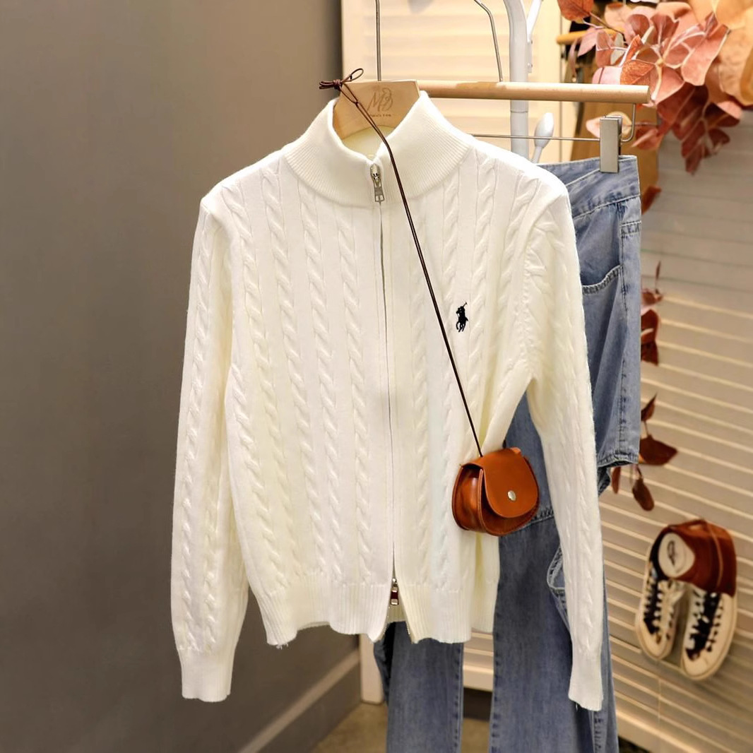 白いスタンドカラーのダブルファスナーのセーターのカーディガン