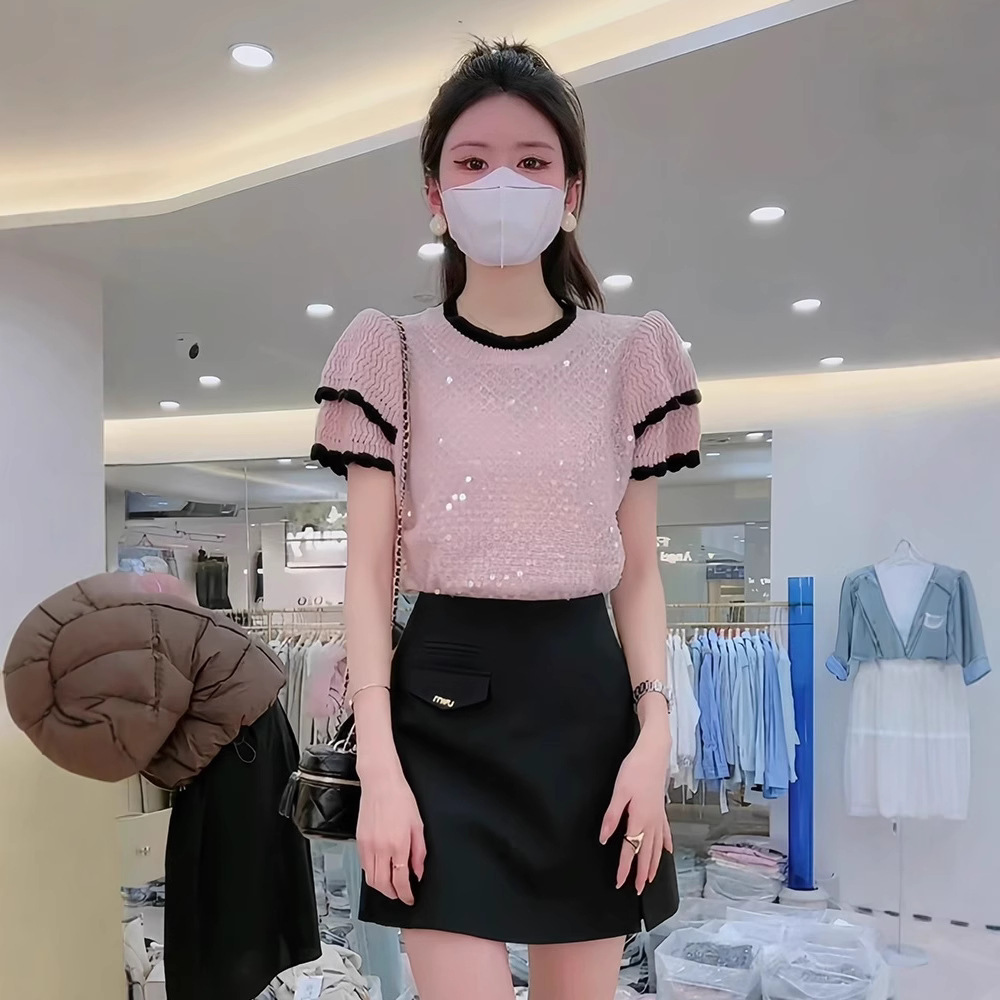フランスの重工のスパンコールのつぼみの袖のプルオーバーのニットのセーターの女性の2024春夏の新型の丸首の半袖の上着