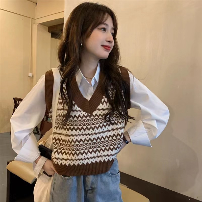 レトロ減齢vネックニットベストの女性は上着を着ています。