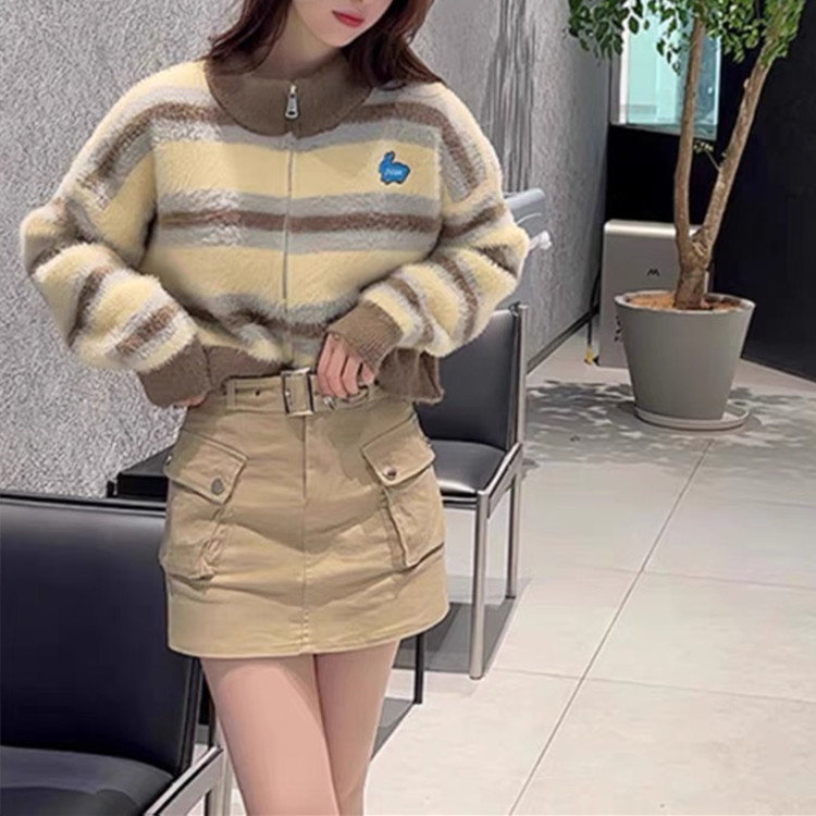 色のスタンドカラーのストライプのニットのカーディガンのセーターの女性の秋冬の新型はミンクの毛のファスナーの馬の毛の上着をまねます。