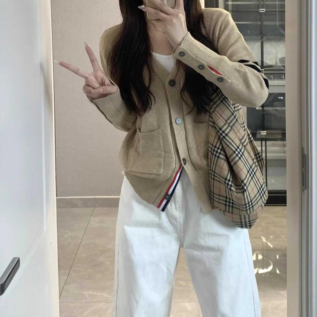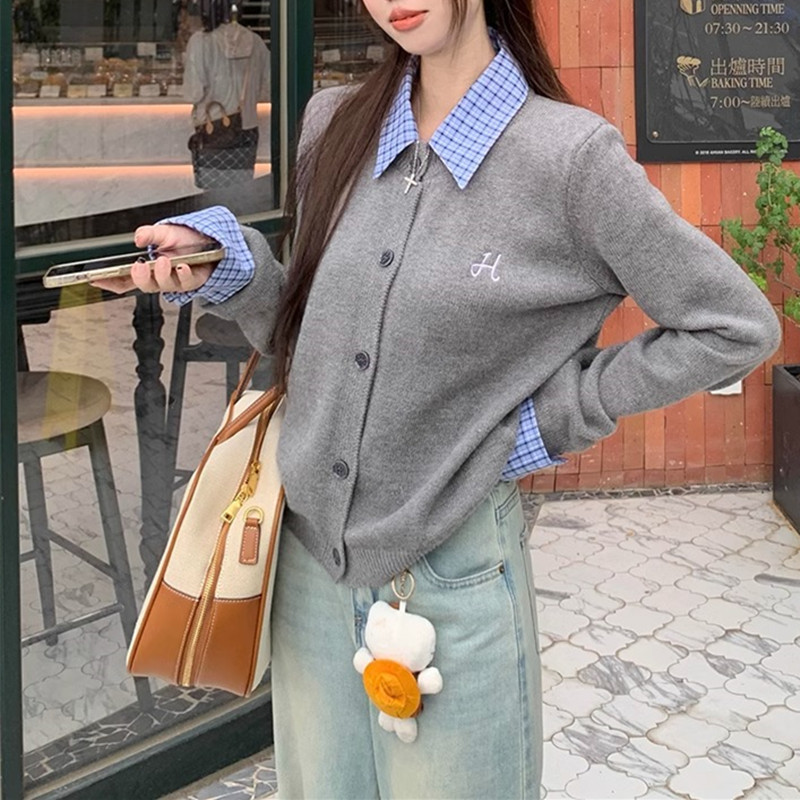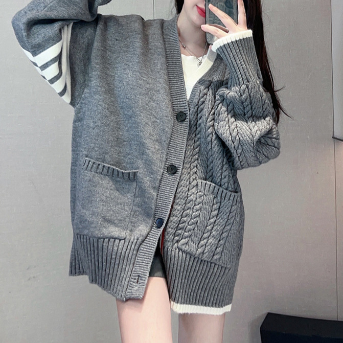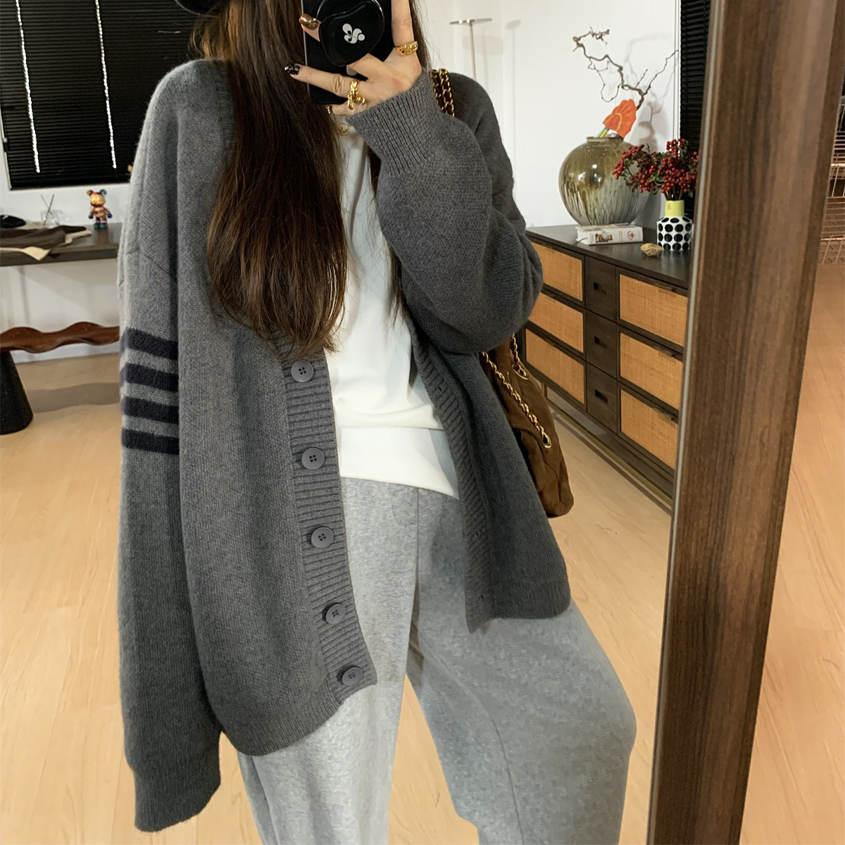 学院風の灰色のセーターのカーディガンのコートの女性の秋冬の2024の新型の怠惰な風のvネックのニットはゆったりしています。