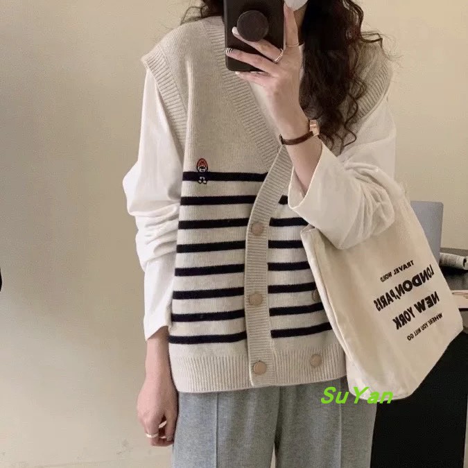 ストライプニット馬甲女秋冬2024新型vネック単列ボタン袖なしセーターカーディガン外着カンデスベスト