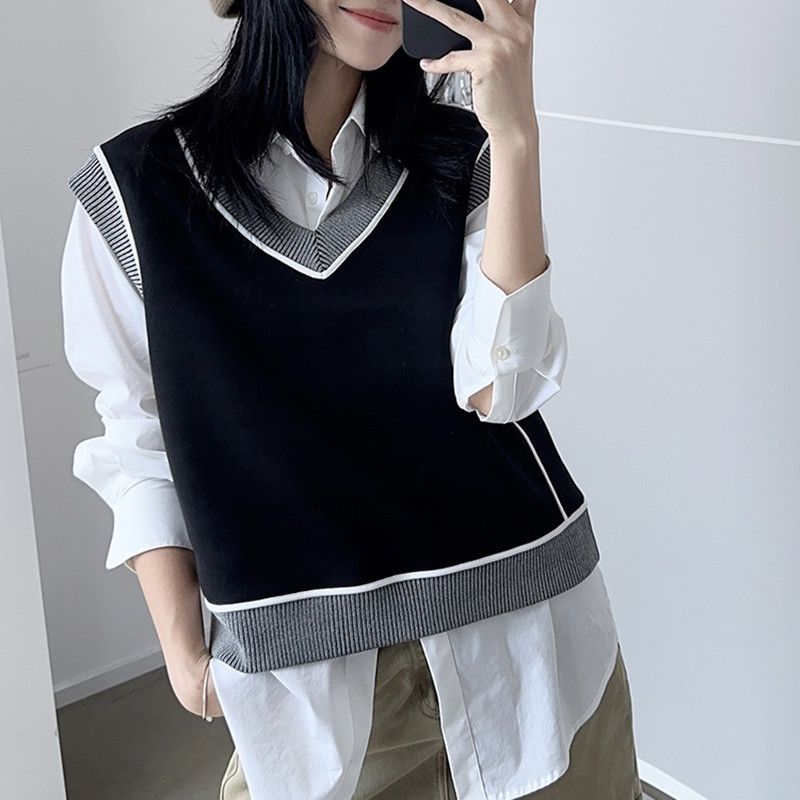 2024早秋の独特なベストの色合わせvネックニットのベストの外に袖なしの重ね着を着て通勤上着を着ます。