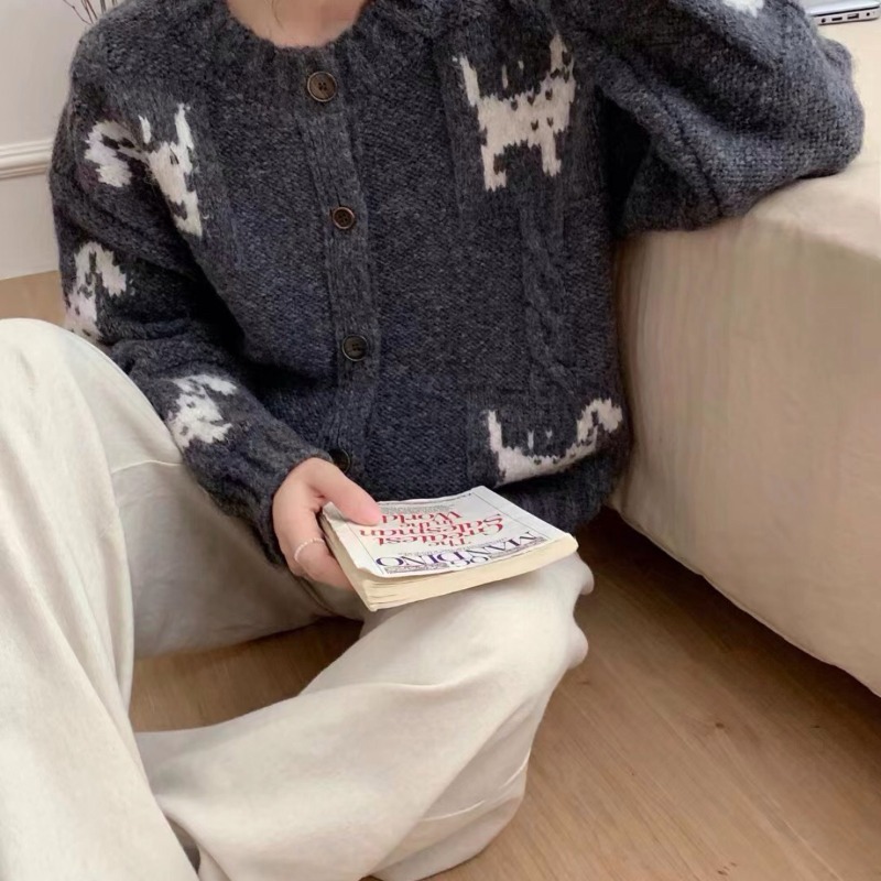 グレーの子犬のセーターのコートの女性の秋冬の厚い短い金のゆったりしている小さい子の怠惰な高級感のニットのカーディガンの早秋