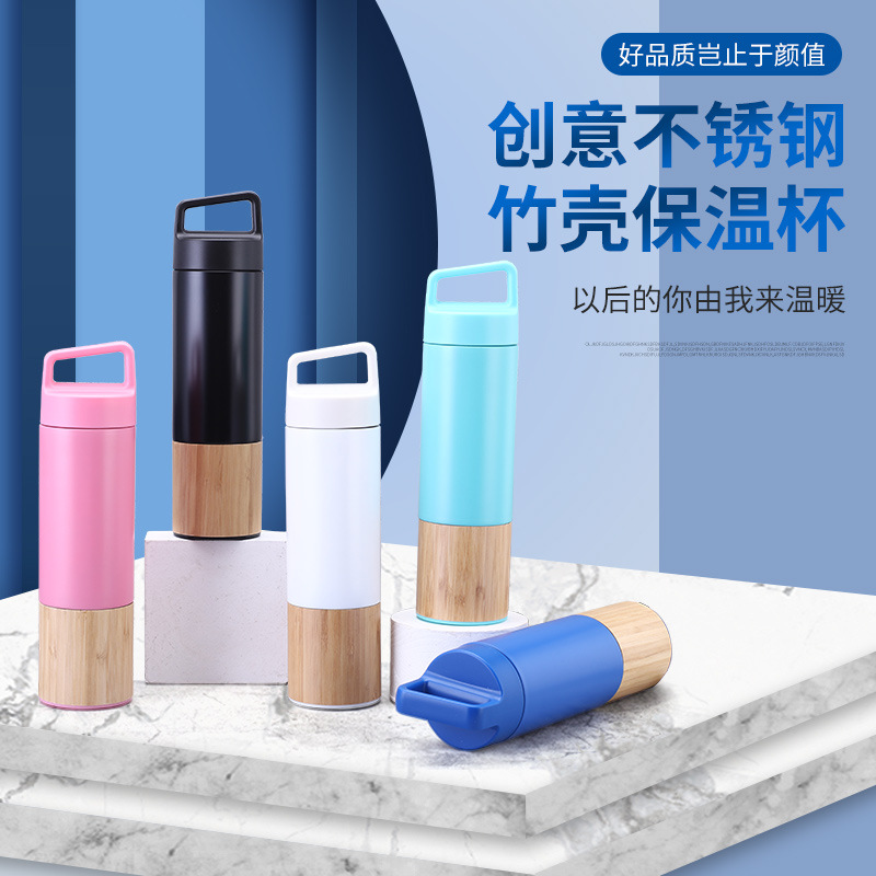クリエイティブ竹シェルカップステンレス鋼魔法瓶カップポータブルポータブルウォーターカップマルチカラースプライシングストレート家庭用カップ外国貿易卸売
