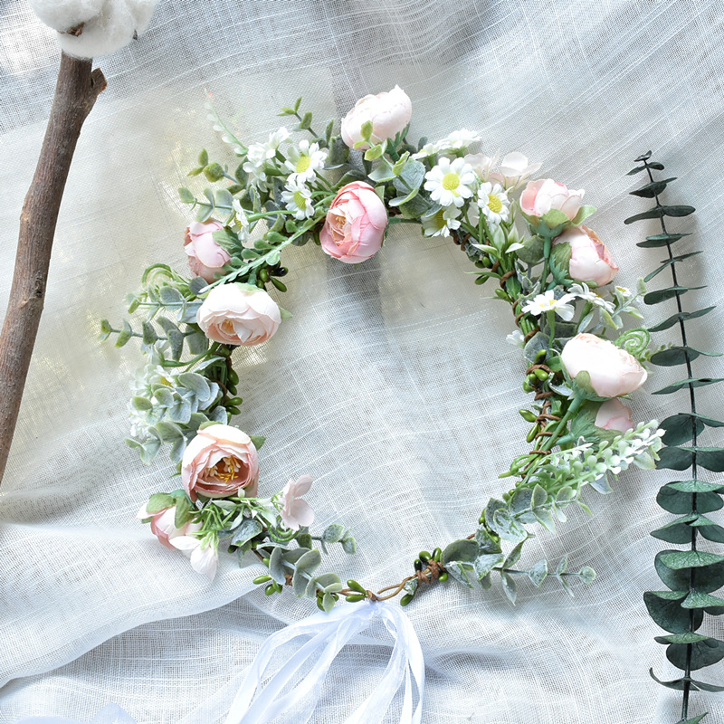韓国の花嫁ビーチ写真撮影ライトブルーカモミール椿のつぼみの頭飾りシャンパンピンクカモミール椿のつぼみの頭飾り