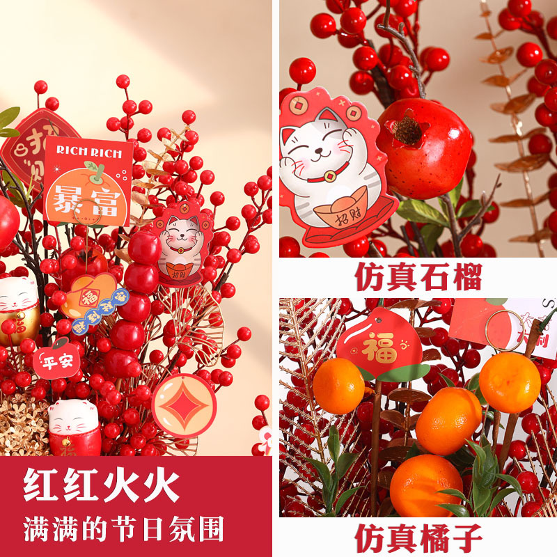 フォーチュンフルーツハグバケツ赤いフルーツオーナメント新年新築祝い装飾アレンジメントリビングルーム大晦日花新年祝福バケツ造花