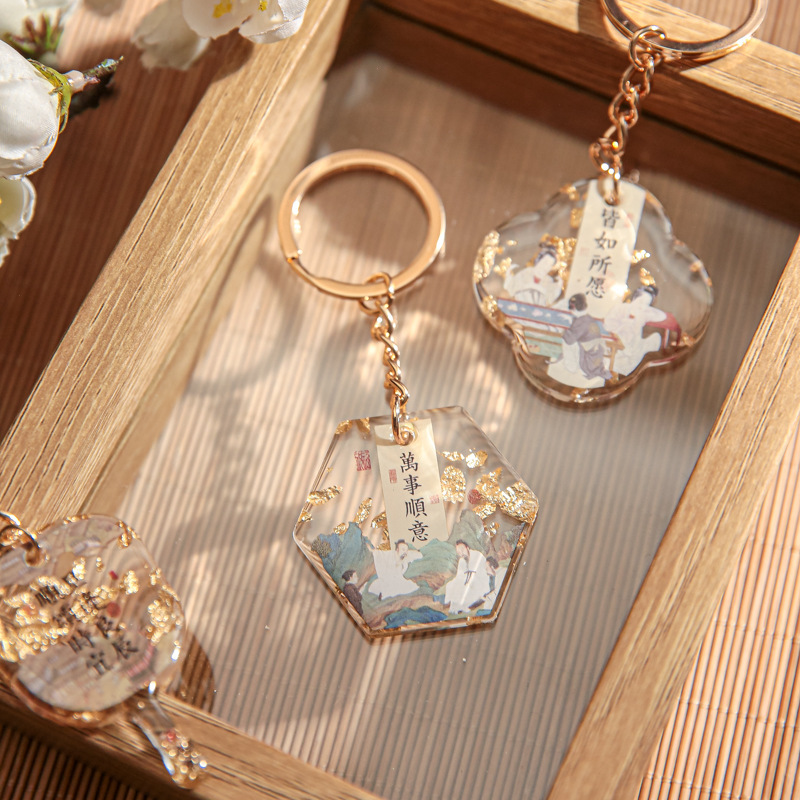 Happy World 古代風の詩と有名な絵画キーホルダー金滴アクリル祝福レトロペンダント卒業ギフト