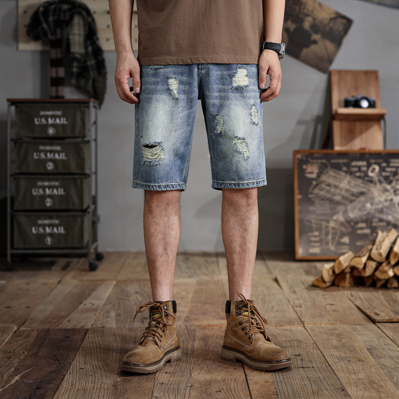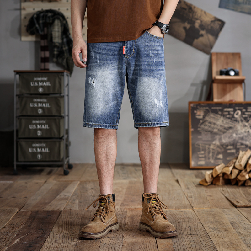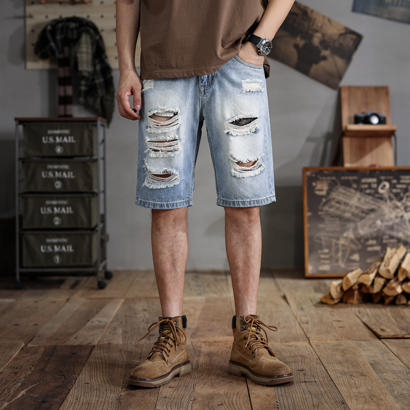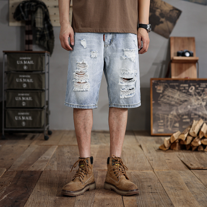 D5504 | ビッグサイズの男性服夏の新しい糸を剃って穴を割ったカウボーイパンツ男性のゆるいファッション綿五分パンツ