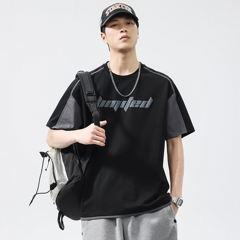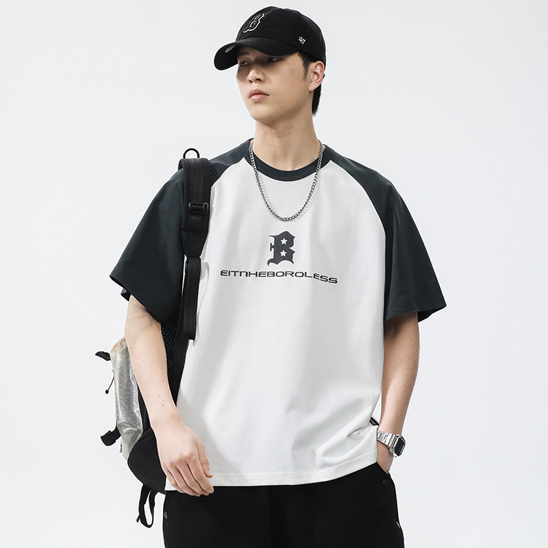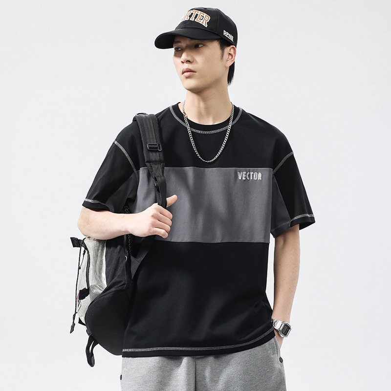 T3350 | ビッグサイズの男性服夏の新商品250g丸首tシャツゆったりとしたコンビネーション衝突色プリント半袖男