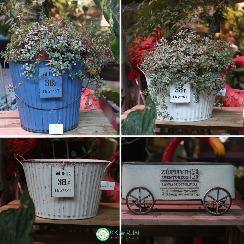 鉄芸長方形四輪車鉄盆日系レトロ長条園芸雑貨縦紋手提げ桶双児盆