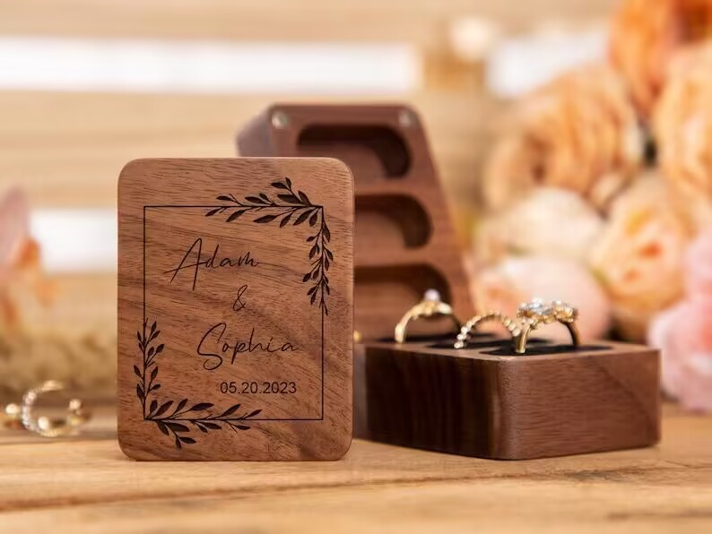 名前日付実木胡桃木箱ピアスリング箱結婚式リング箱3位指輪収納箱