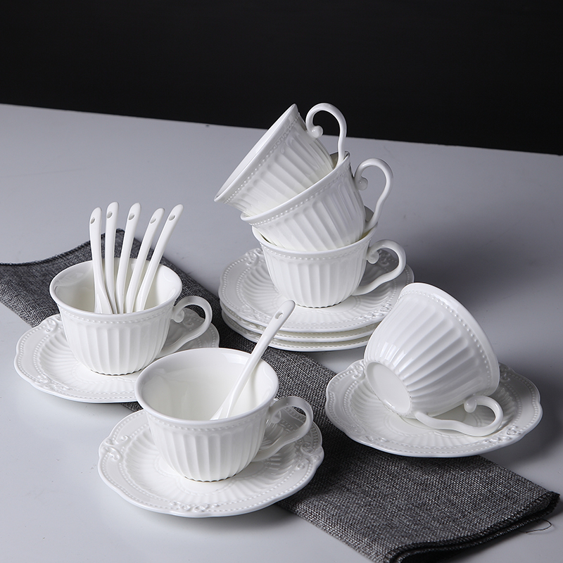 宮殿スタイルのコーヒー器具ヨーロッパスタイルのエンボス加工コーヒーカップとソーサーセット棚スプーン付きホームアフタヌーンティーミルクティーカップ
