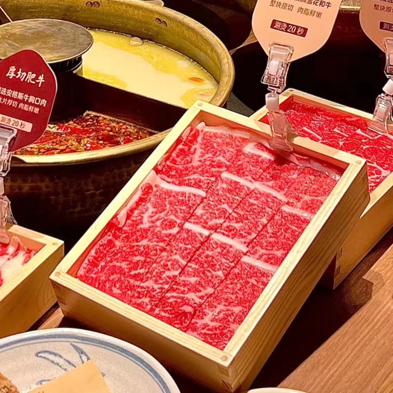 ネット有名人の特徴的な業務用バーベキューショップ、和牛プレート、無垢材箱、バノ鍋、同雪花牛食器