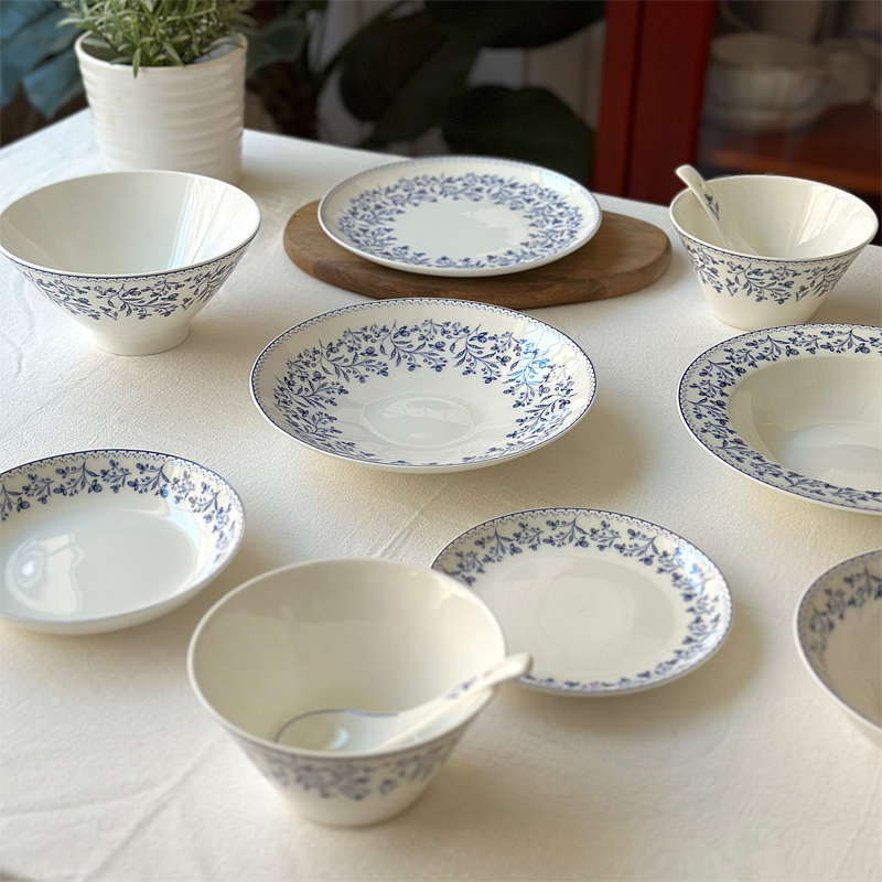 下絵色の骨董磁器の皿とボウル、深いスープ皿、ディッシュプレート、デザートプレート、笠ボウル、ライスボウル、食器セット