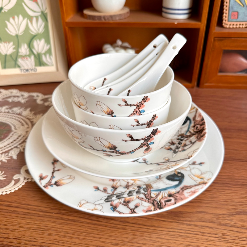 新しい中国風のマグノリア、鳥、カササギ、ボーンチャイナのプレート、ボウル、ヌードルボウル、小鉢、スーププレート、平皿、野菜プレート、セラミック食器